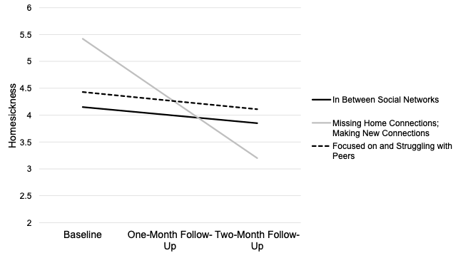 In particular, we found that students showed different patterns in the ways they discussed successes and setbacks in their social relationships. One group that stood out initially reported more concerns about missing family and friends back home as well as new opportunities to make friends on campus. These students initially had the poorest scores in college adjustment and well-being, BUT they also reported the largest improvements over time.